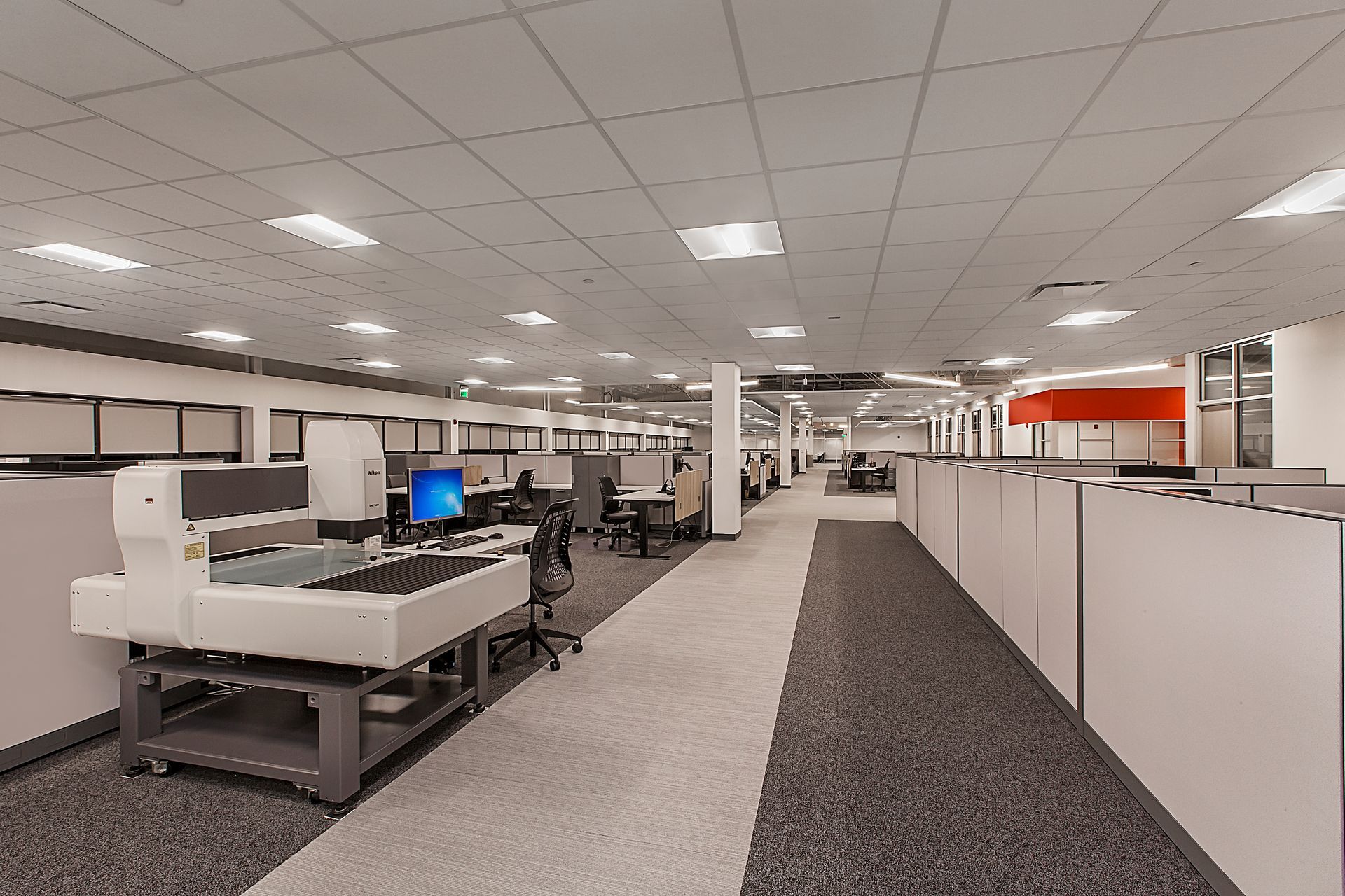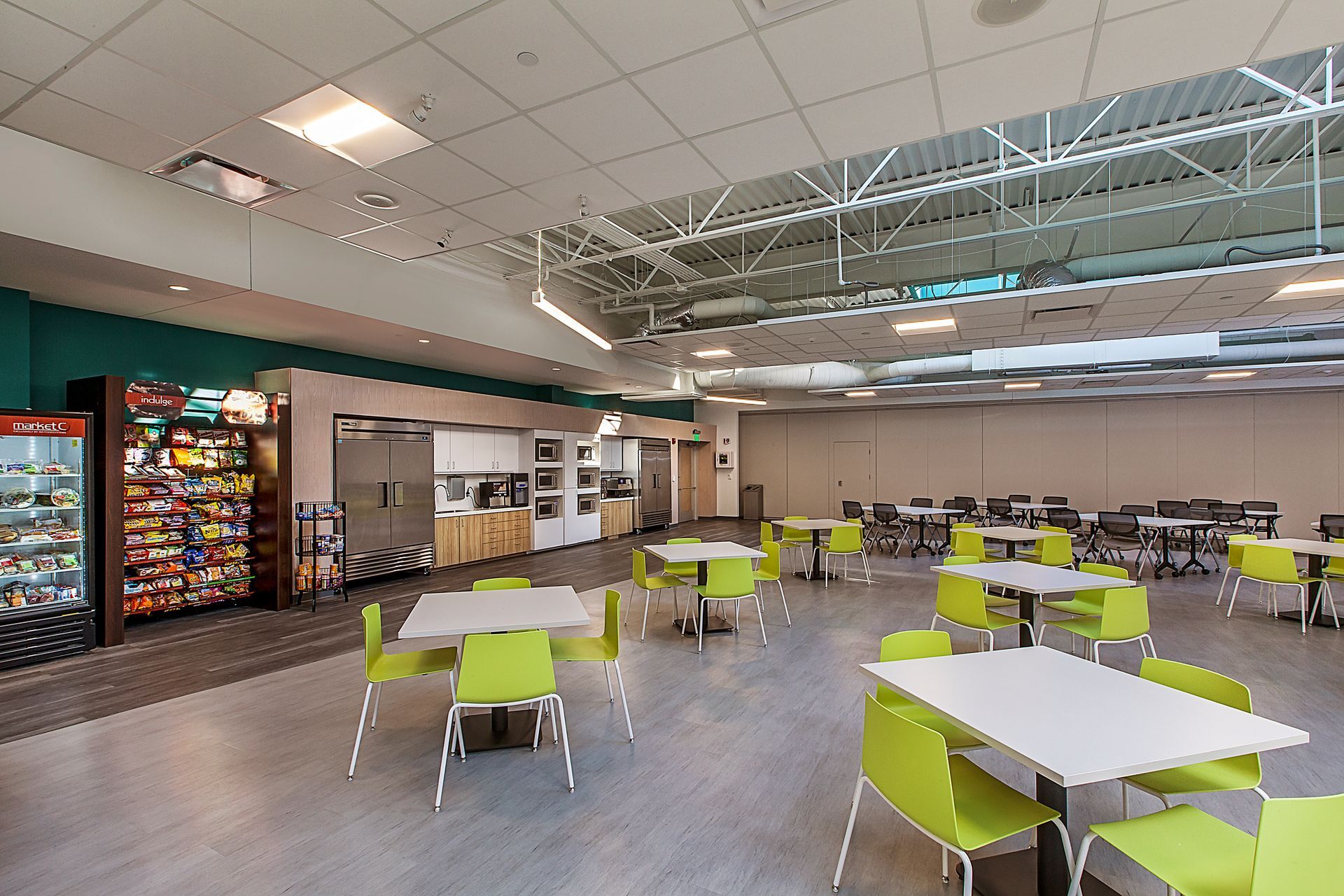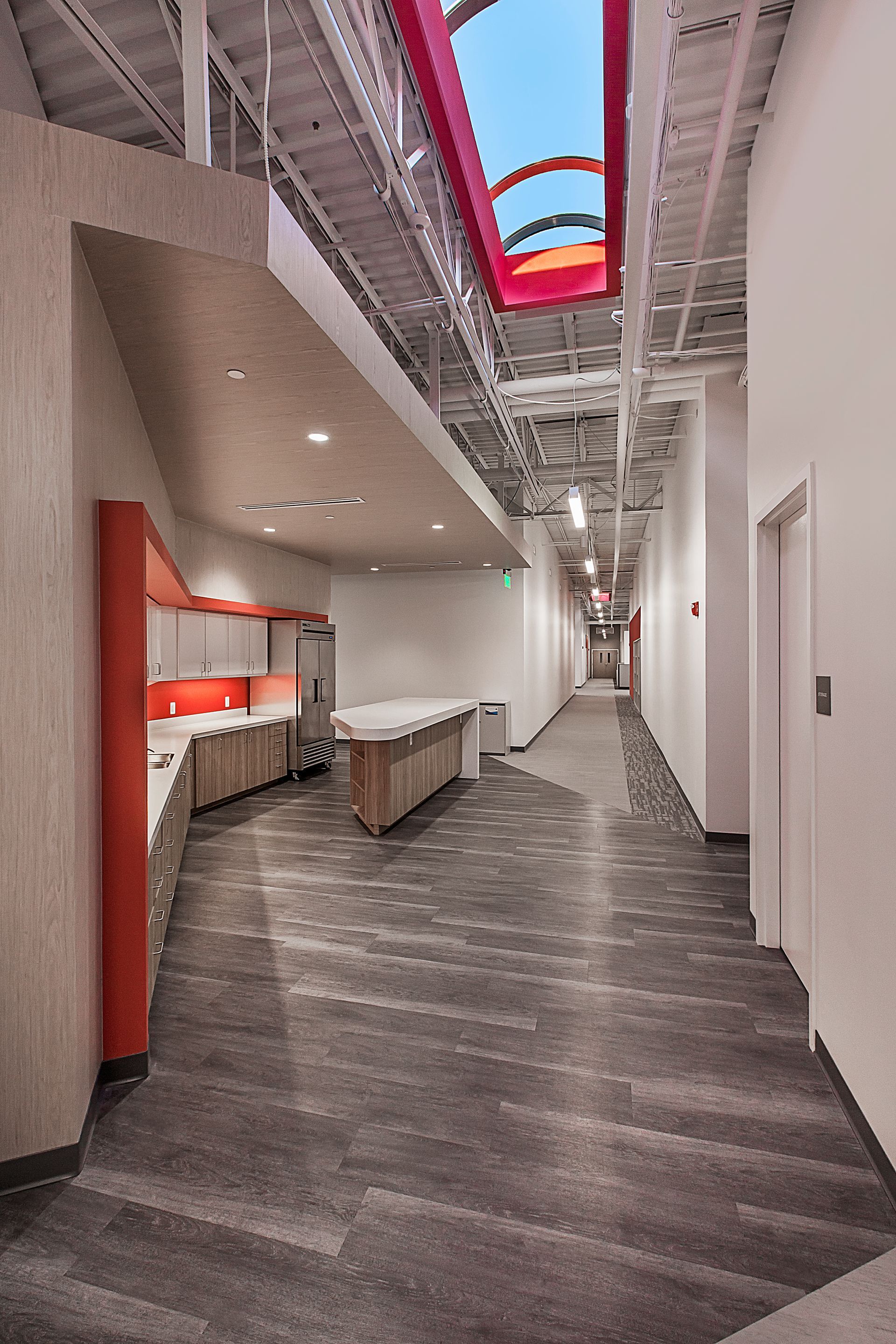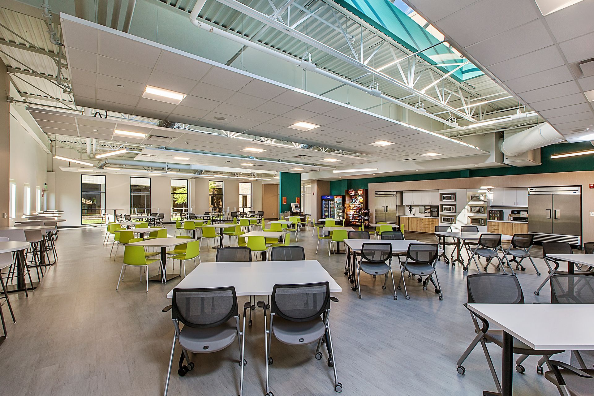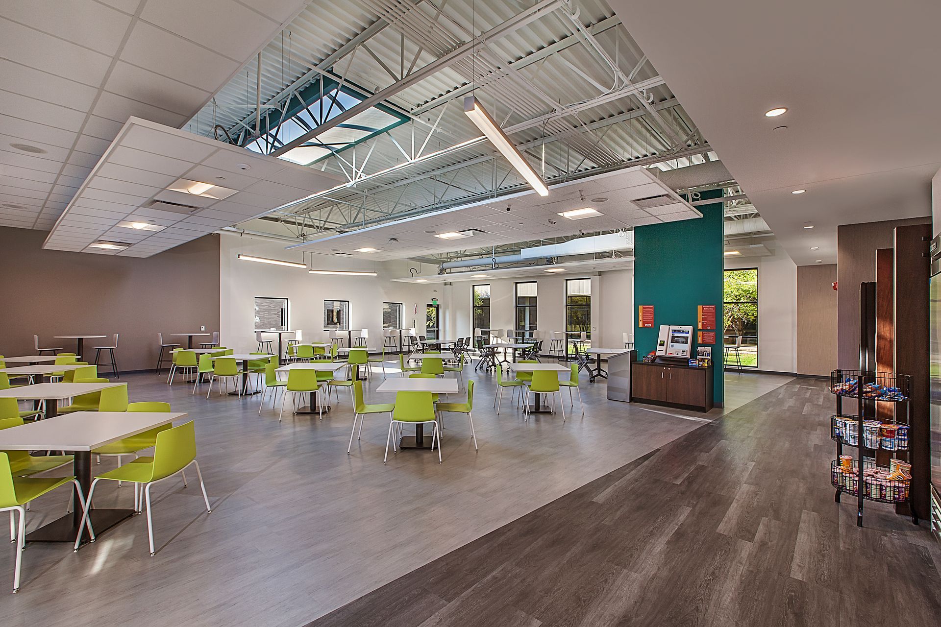 Also, along the exterior walls of the building are large windows which provide views and more light to the building. New skylights were installed in the new cafeteria. The managerial offices have glass walls to not only allow light in, but also to provide transparency to their employees.