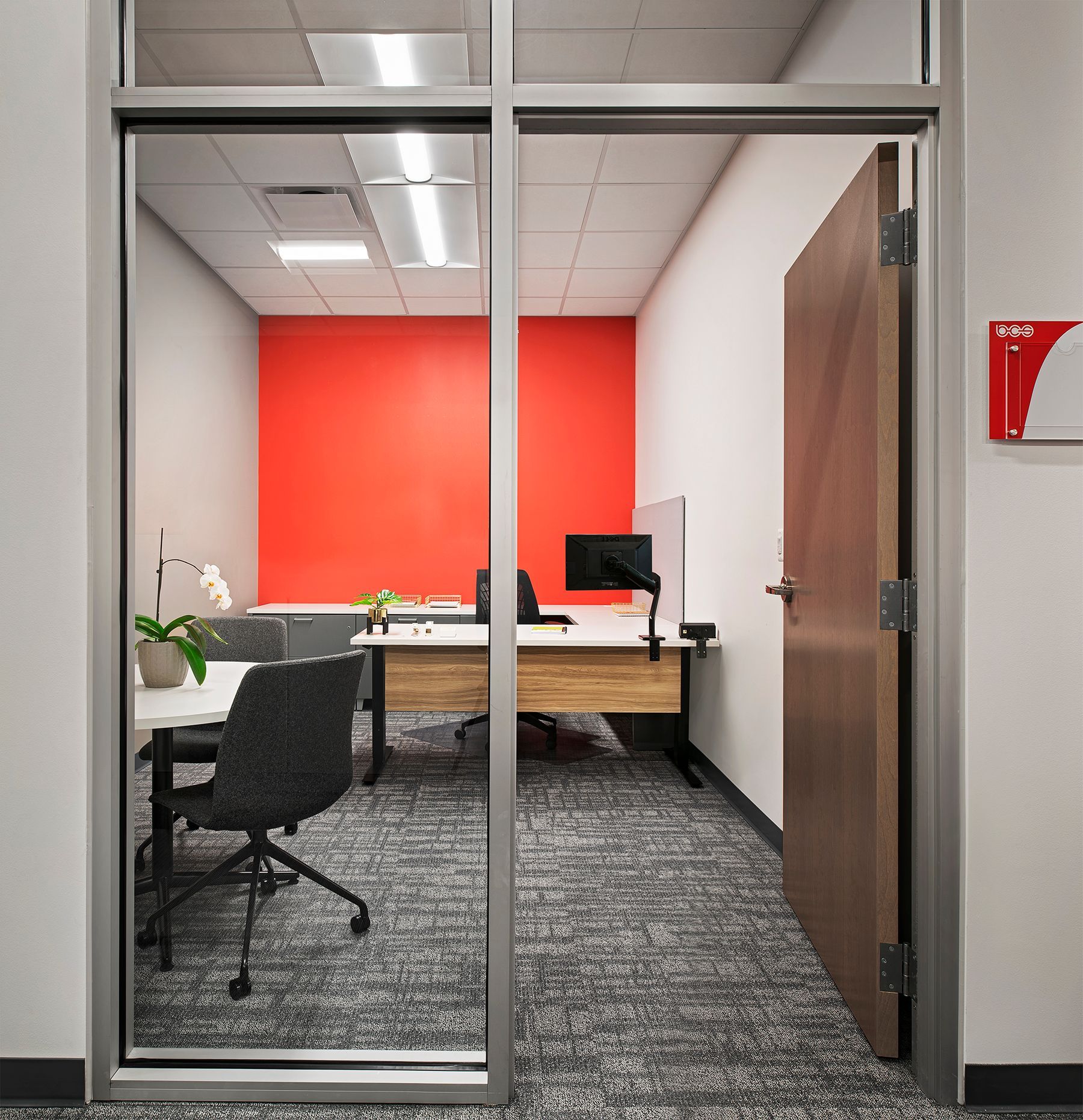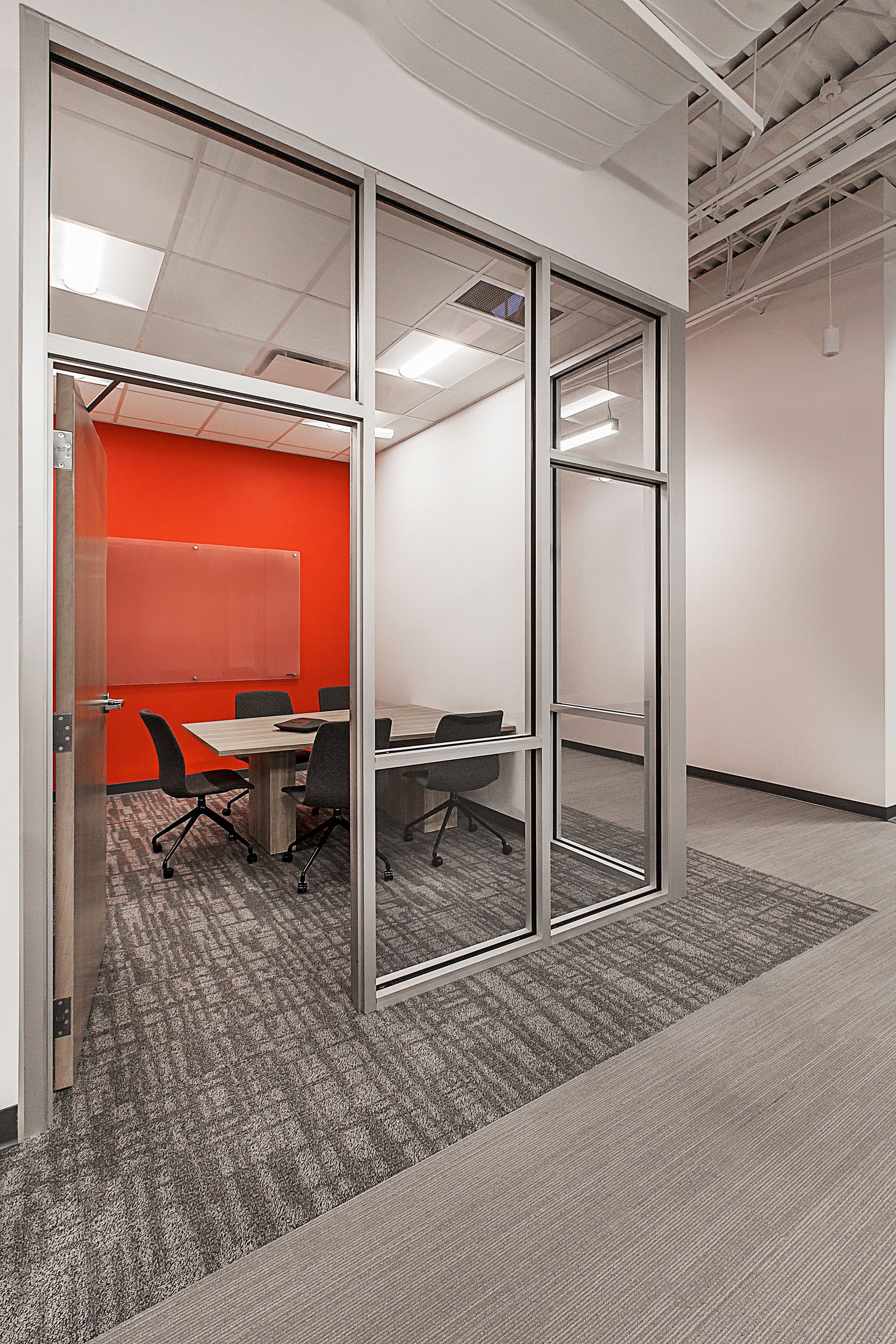 To delineate separate spaces without enclosing them, we used techniques such as changes in flooring material or a change in ceiling level. Another system utilized was the use of perforated panels which can be removed and relocated. Through these practices, it allows the space to be flexible as the company grows and the needs of the workers change.