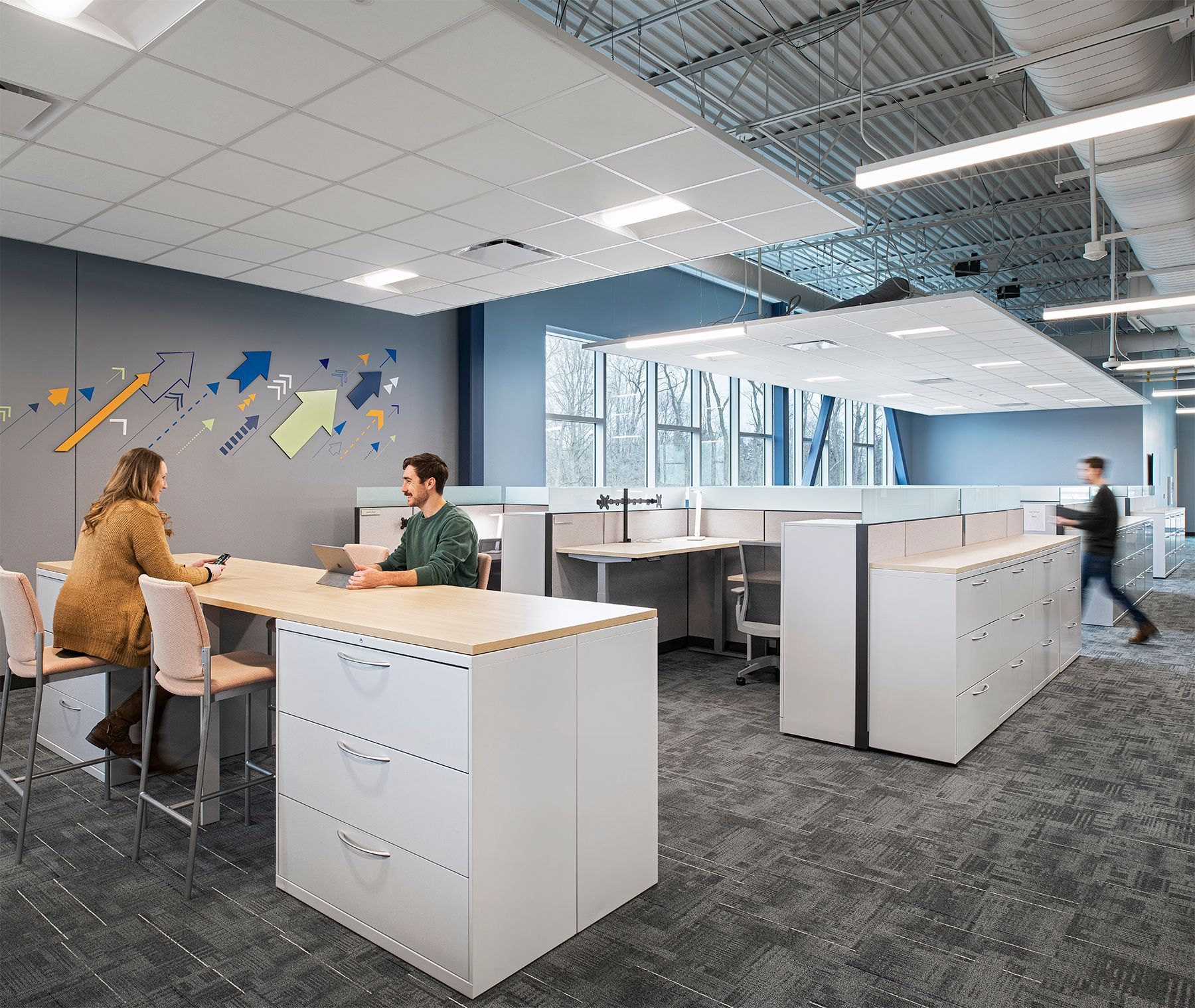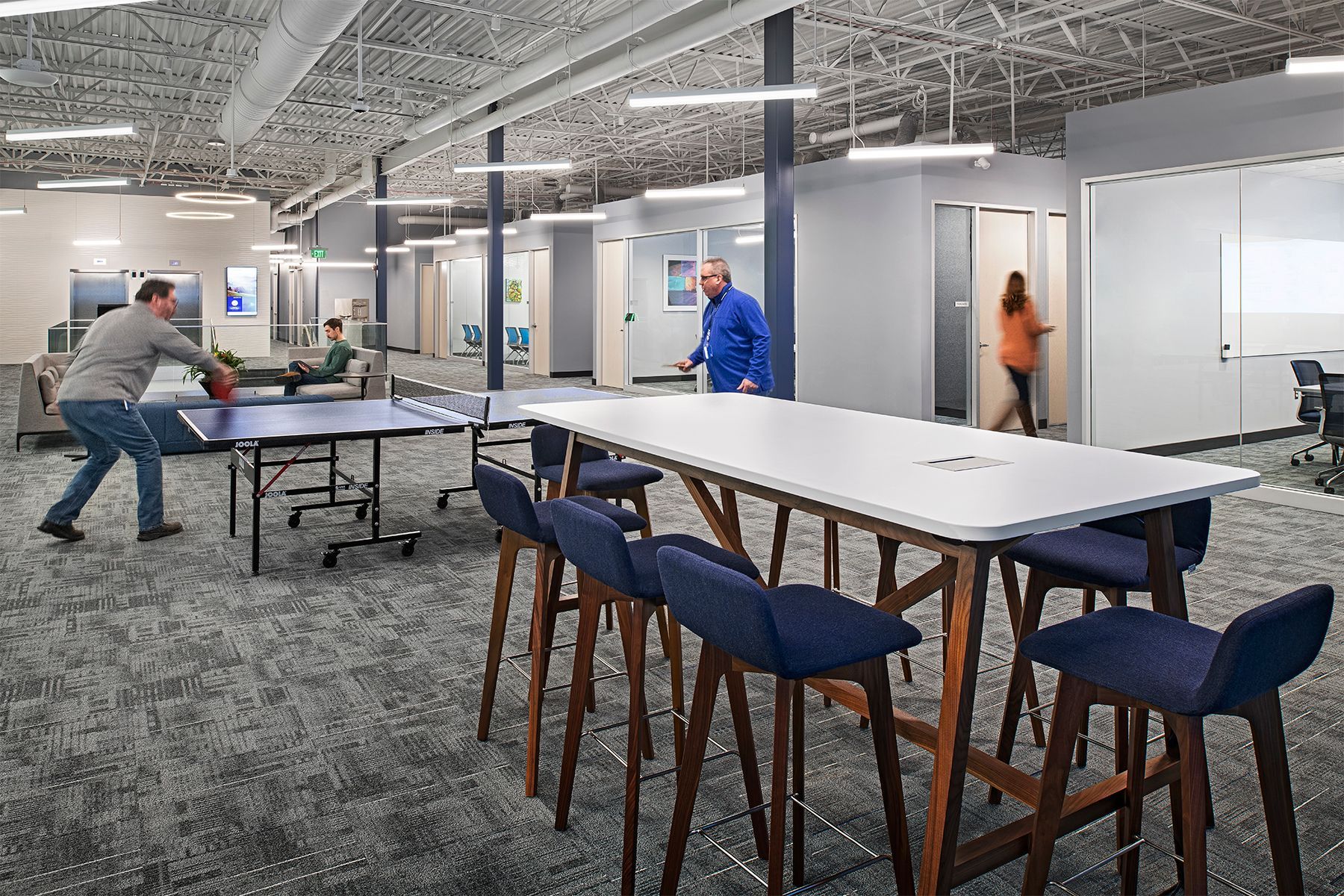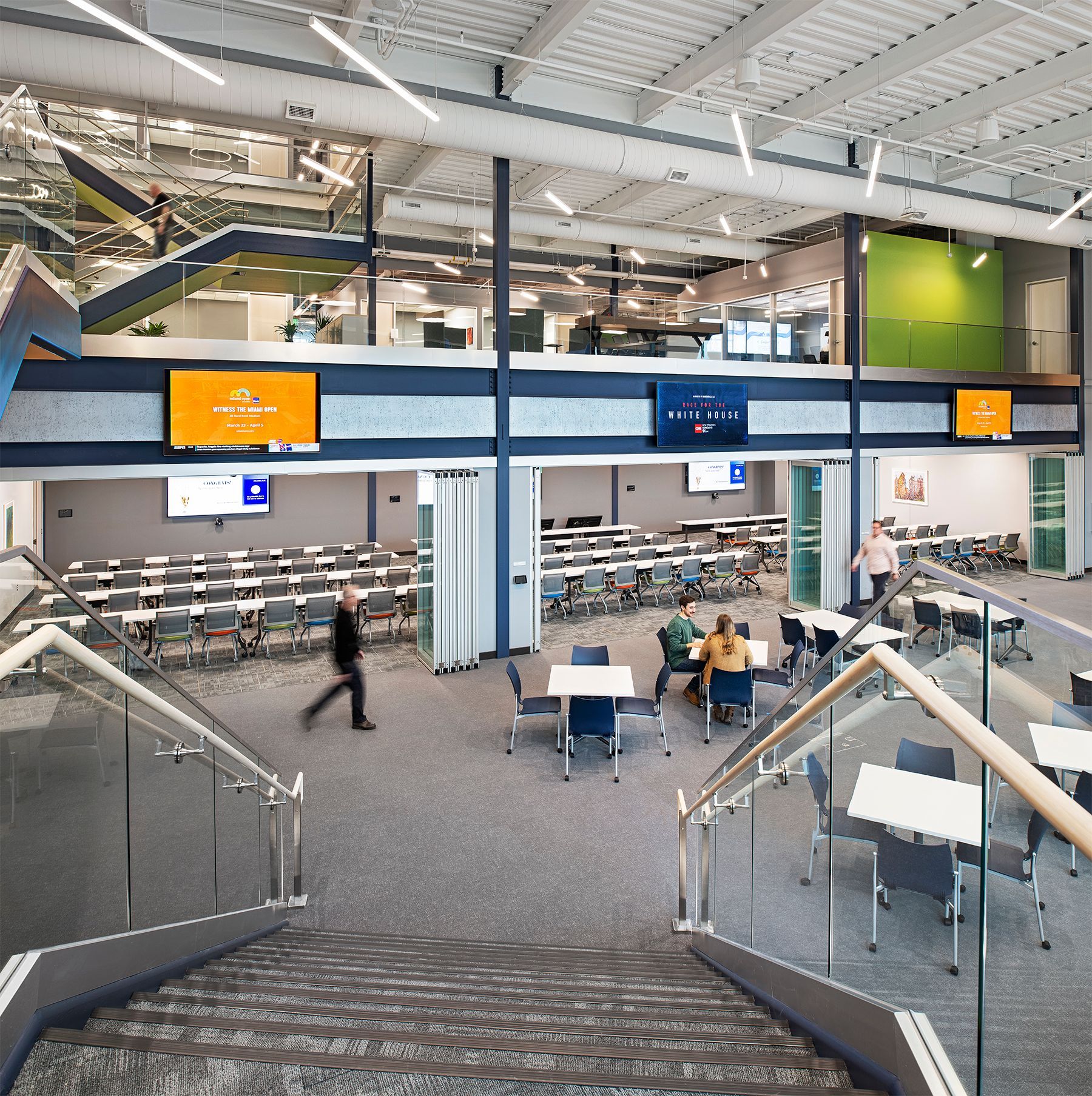 Large and small collaboration zones spread throughout the plan allow cross-departmental collaboration. Three different bricks and two different metal panels create layering on the exterior. The semi-glazed black brick features an iridescent finish that shimmers and changes tones as daylight conditions change.
