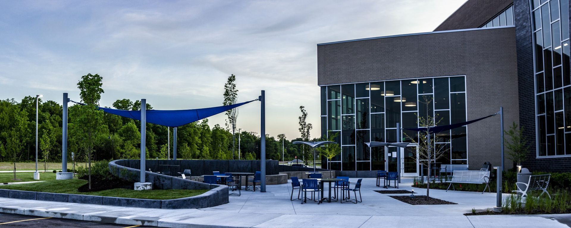 A curving retaining wall starts at the sidewalk and wraps around to the patio. The patio leads into the Apex space which also provides a path for display vehicles entry. Dynamic tinting windows softly release to a lighter/lower tint level as the sun sets.