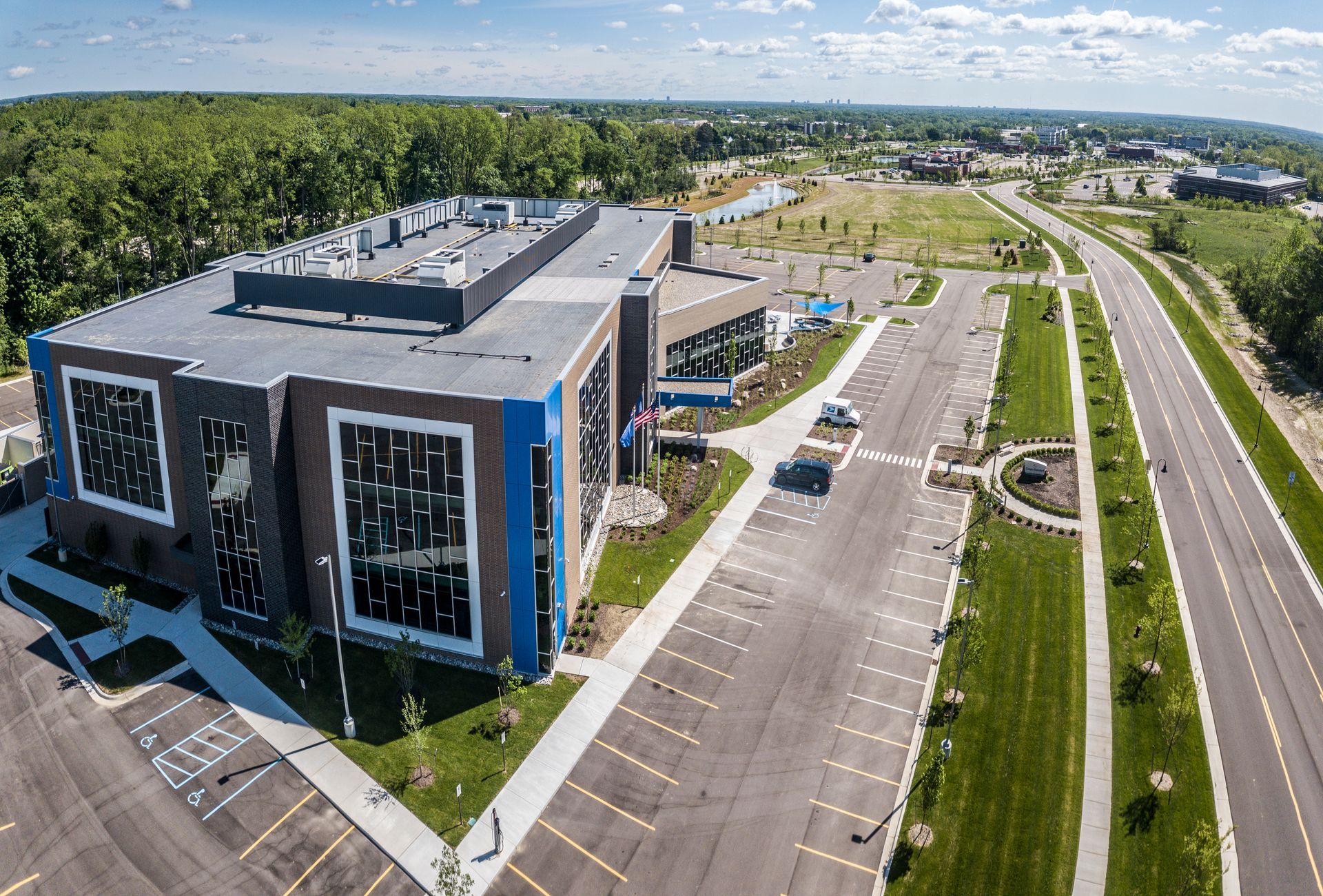 This international automotive supplier’s headquarters provides views and daylight with larger window openings that limit glare and heat through self-tinting technology.