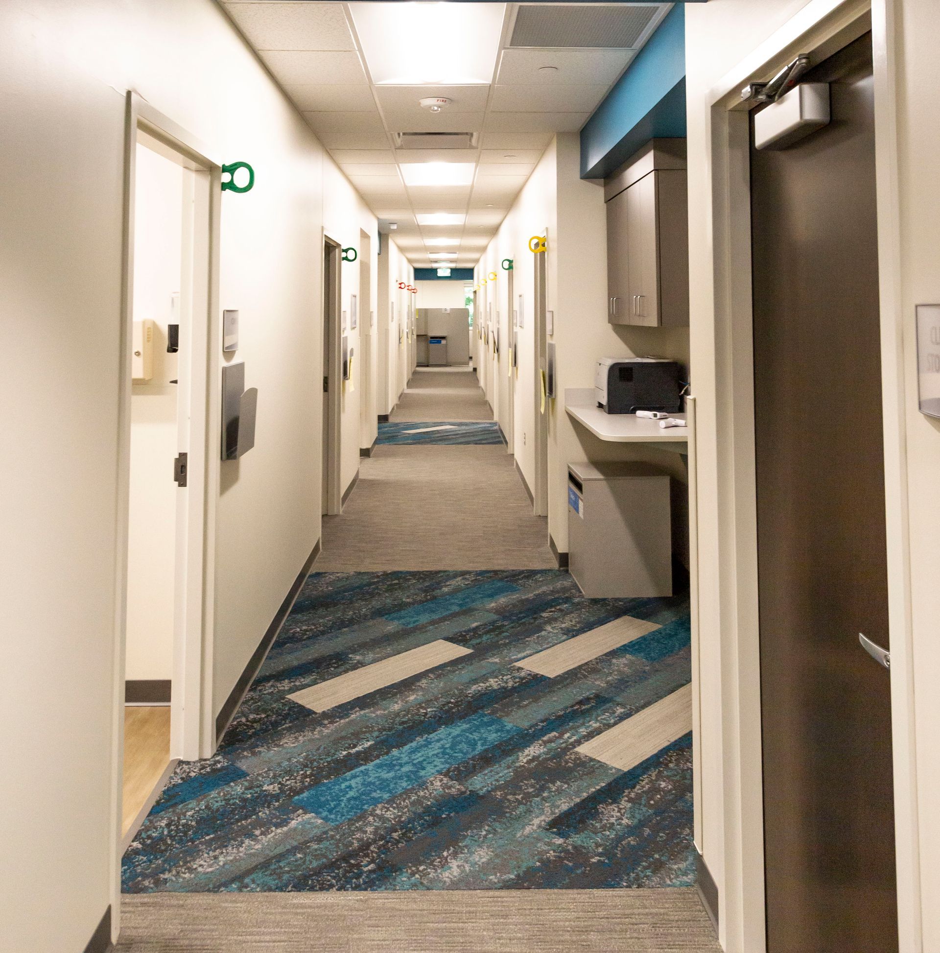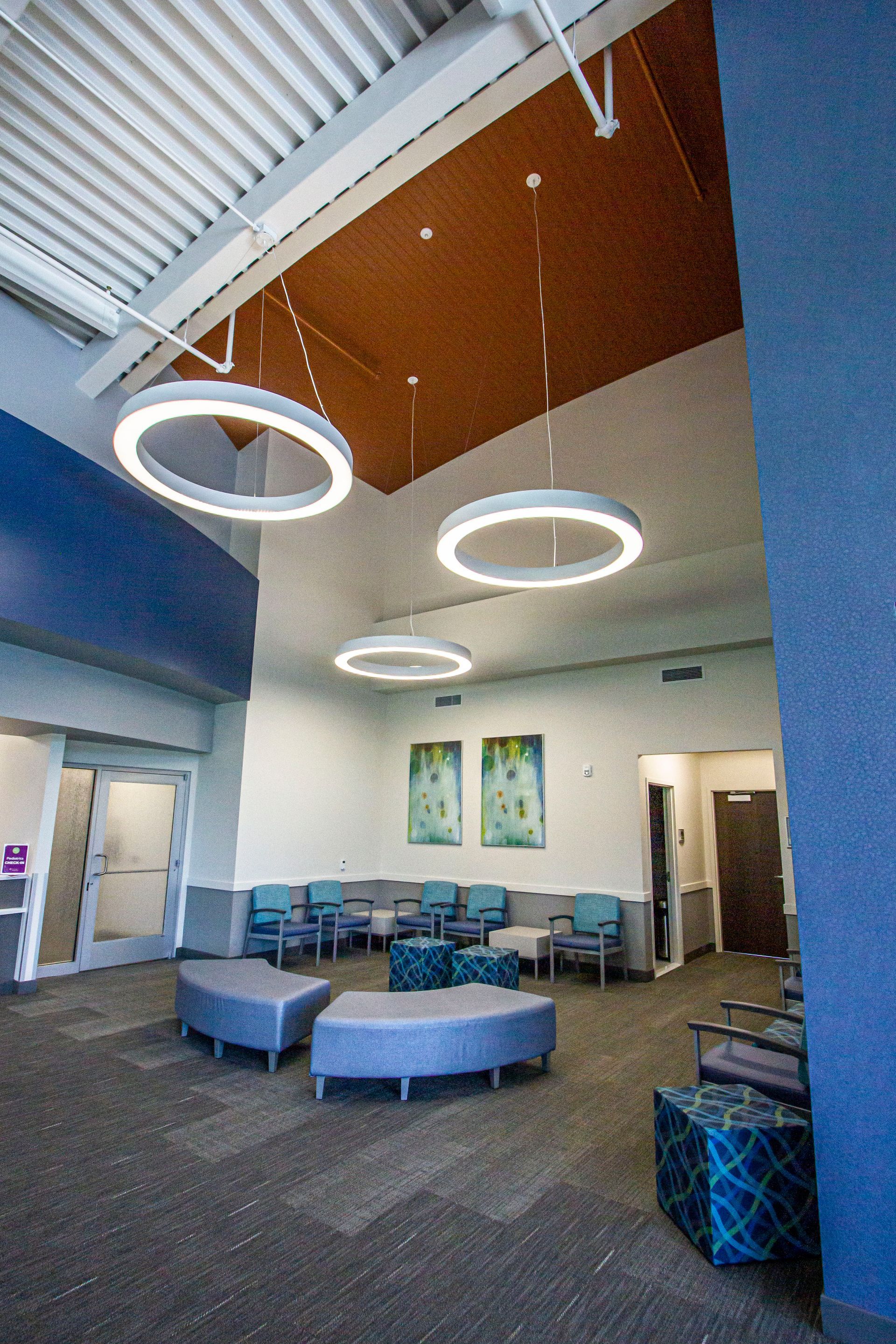 On the interior, materials from the exterior are brought in to create synergy between exterior and interior, while also transitioning to cool, calming colors to promote patient wellbeing and health.