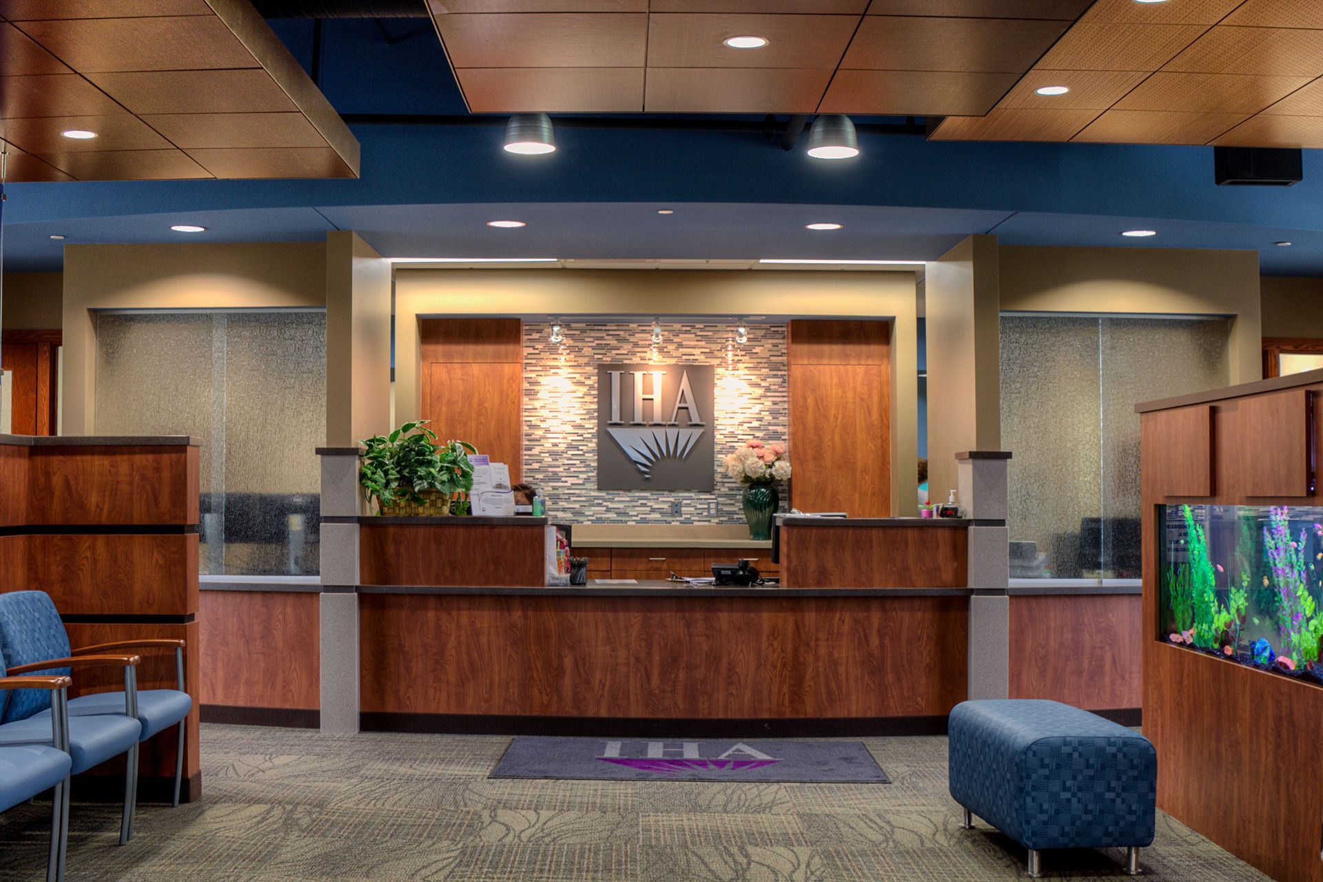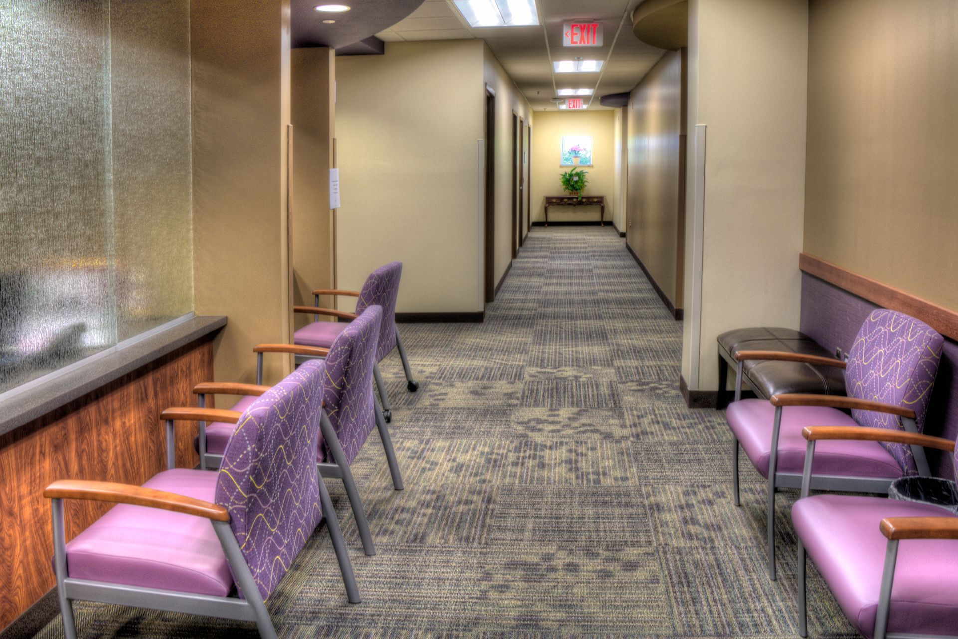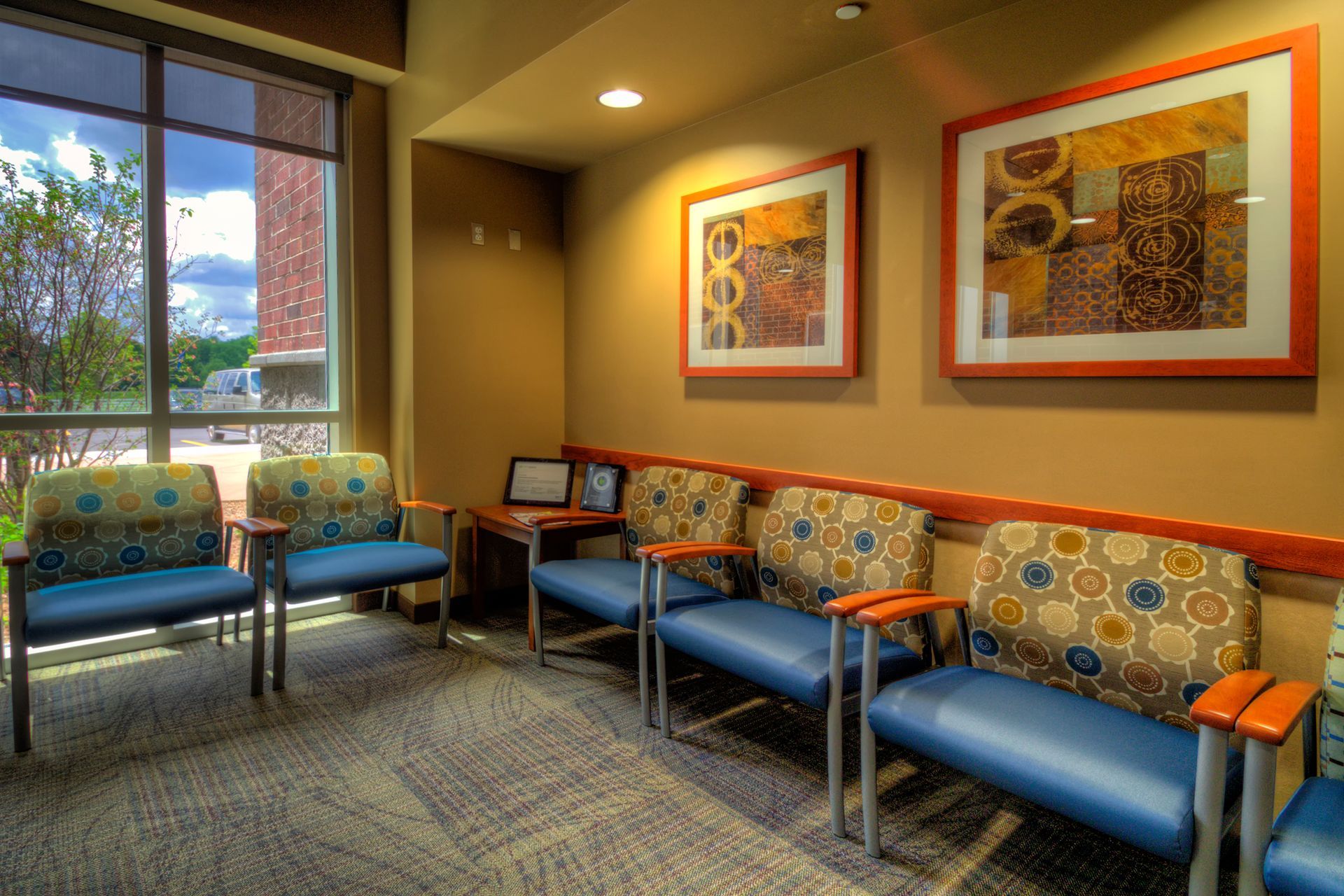 The use of brick, wood elements, and warm colors all help to welcome patients into the waiting rooms. The use of floor-to-ceiling glass on either side of the rooms allows for beautiful views out to the landscaping and park beyond.