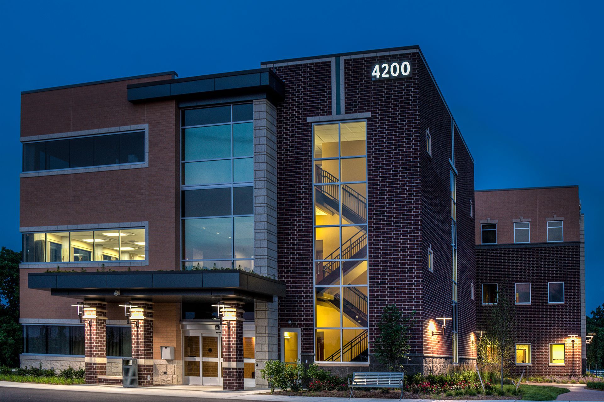 The scale of the building is further broken down into three components based on the program of each segment. The northern component houses the entry with a canopy that reaches out to invite patients and visitors. This area houses the vestibule, vertical circulation, and toilet rooms, as well as a small tenant space on each floor.
