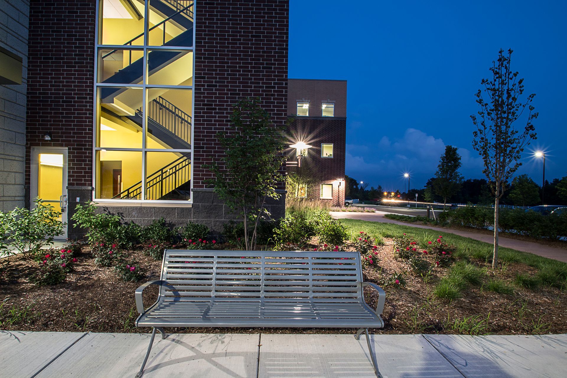 The construction materials of masonry, brick, and composite aluminum panel allow the façade of an otherwise large institutional building to be broken down to a more personable scale while still maintaining the project budget.