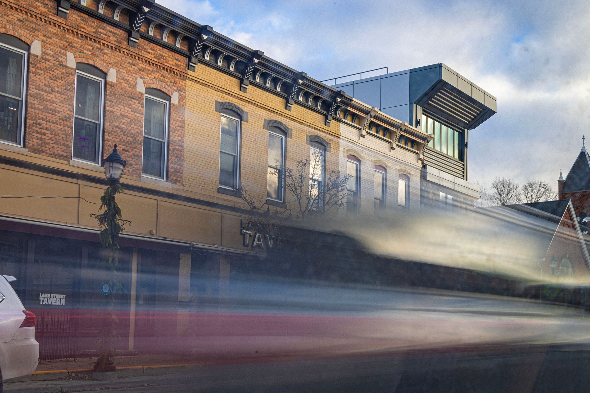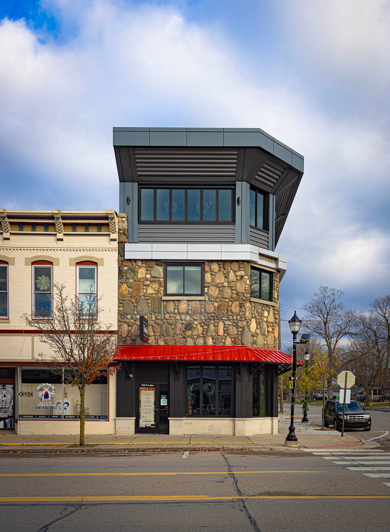 The renovation of a landmark, 1870's South Lyon, MI building in a thriving mixed-use development included the upscale dining of Dua Vino on the first and 3rd floor with private business offices between.