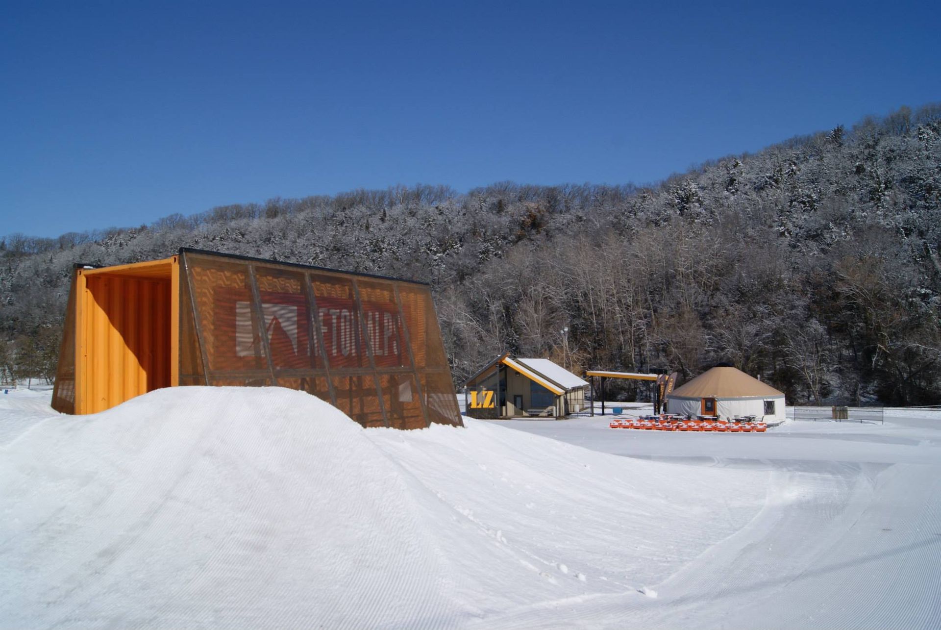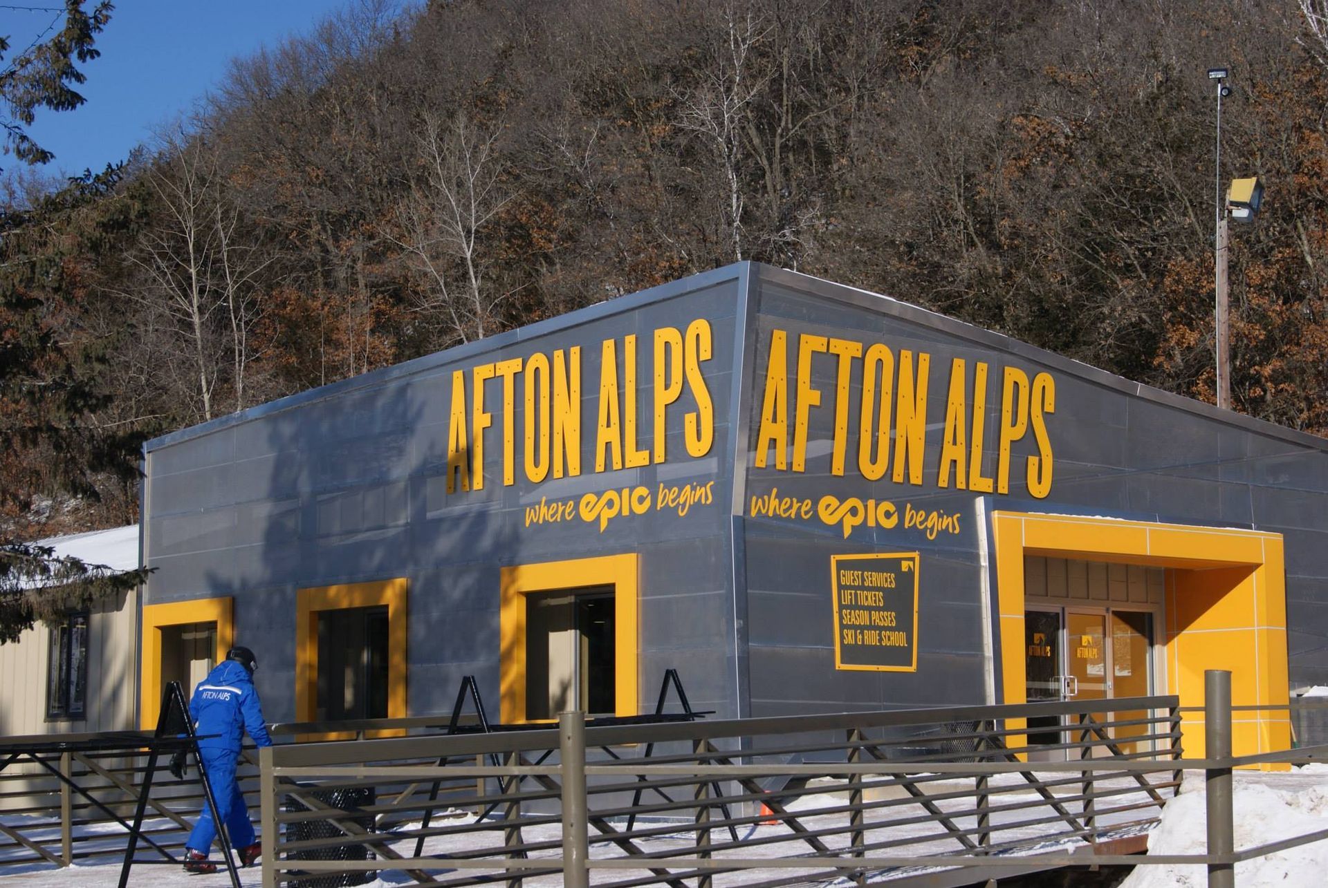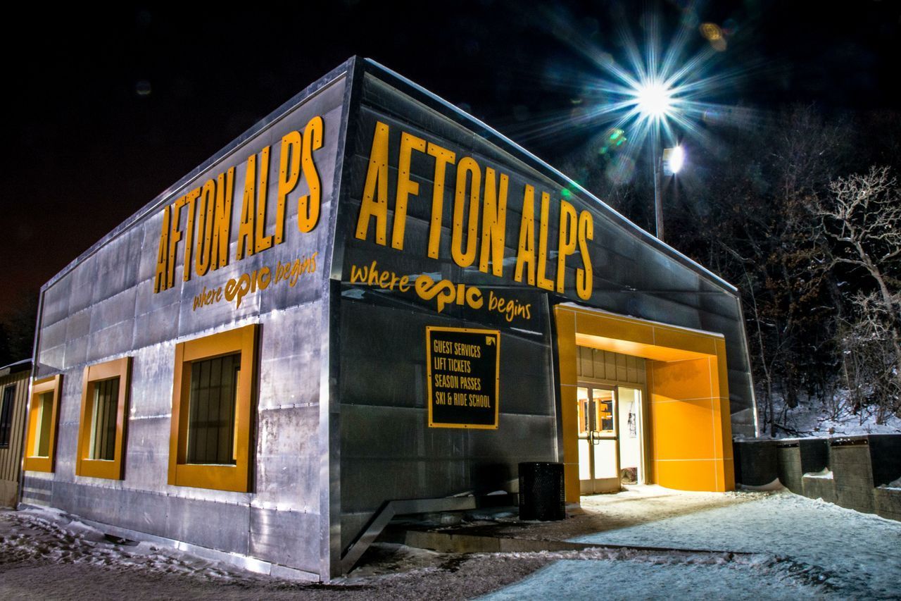 The project scope included renovations in two primary areas of the Afton Alps property. First, a significant façade renovation of the existing Guest Services building, transforming it from obscurity into the primary visitor entrance and transaction point for the park. Secondly, a newly imagined Landing Zone space, designed to foster an energized environment as part of a new snowboarding terrain park.