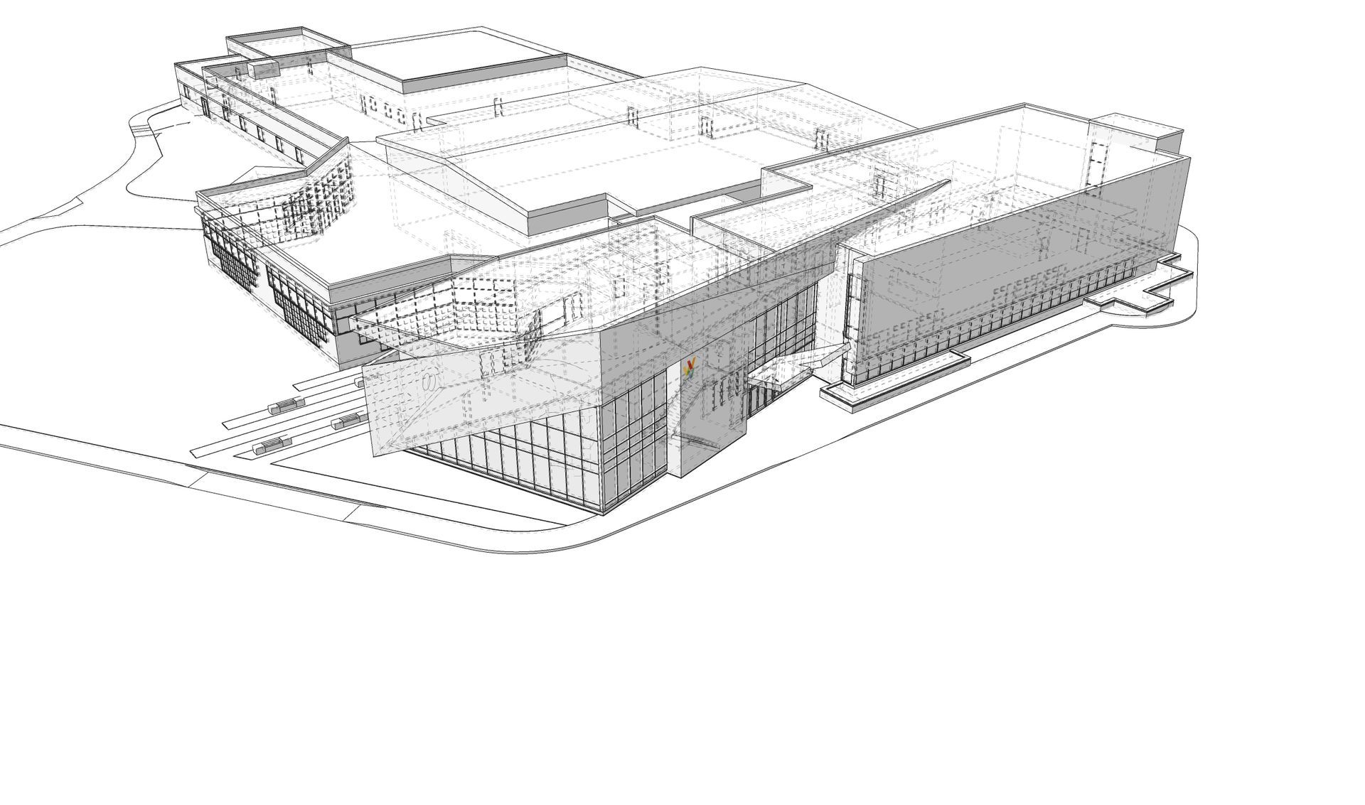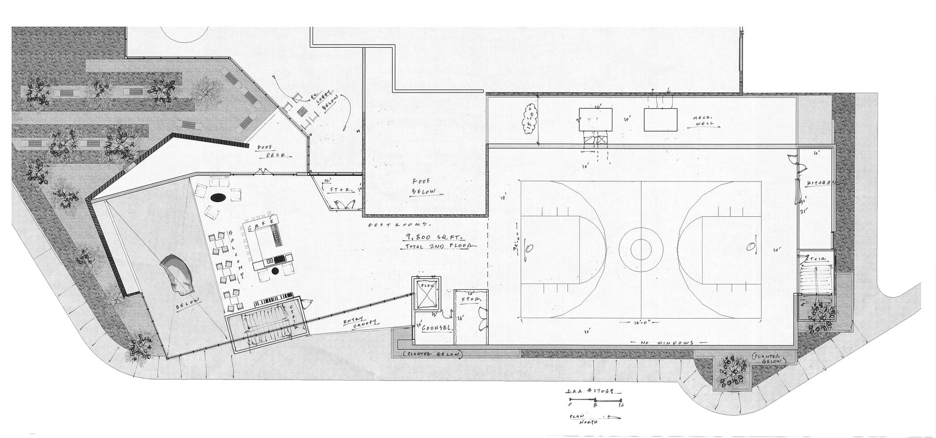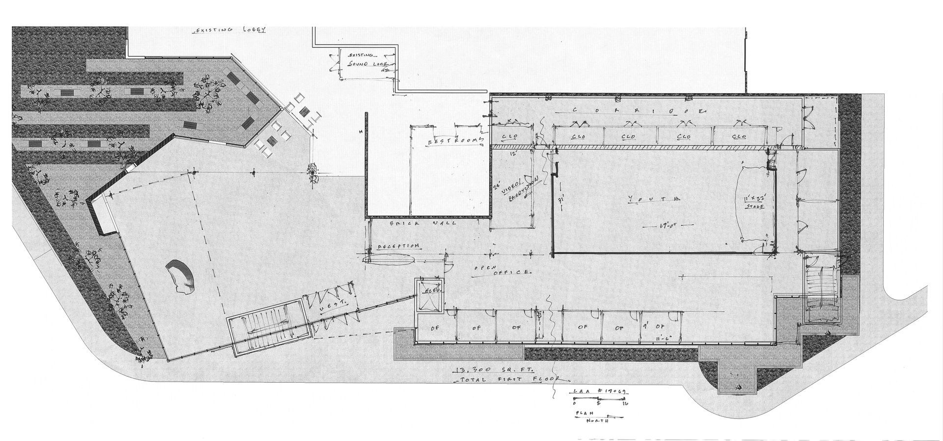 This project looks instead at a two story solution to preserve the existing playground. Office and youth functions will be on the first level with a full gymnasium, prep. kitchen and coffee bar on the second level. Program concept included maintaining an open passage between the new entry and the existing building, running between the two new program blocks.