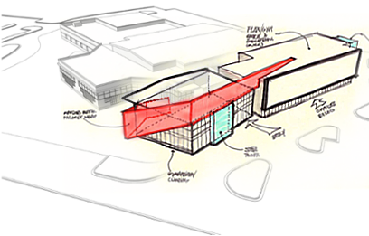 Building envelope concept included the “wrap” and the cantilevered gym mass. The wrap mediates between the transition of the existing building and the new through distinguishing materials and by layering spaces. The wrap continues up around the building to reveal a dynamic climbing rock tower. This reveal also facilitates a horizontal connection between the active street level entry and the climbing feature inside.