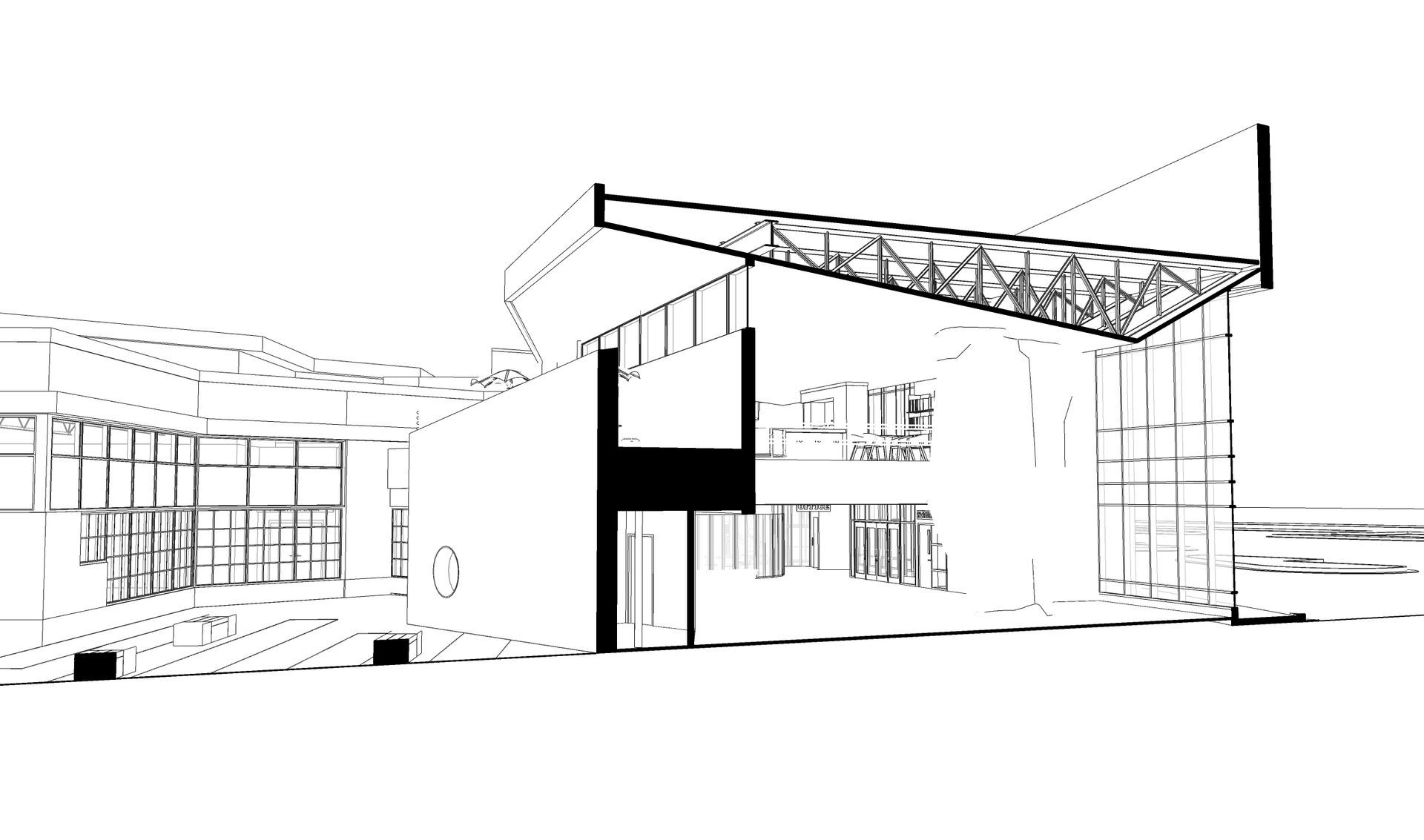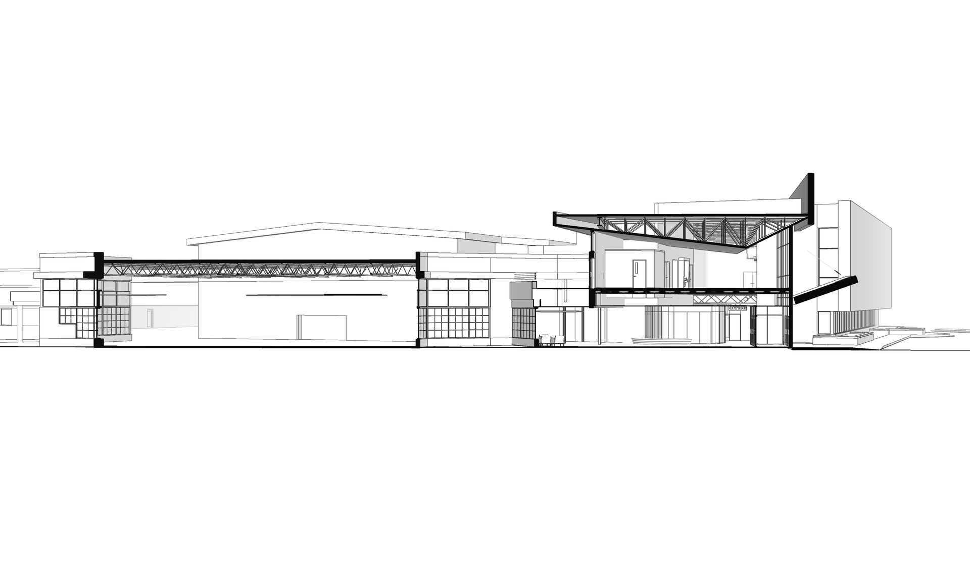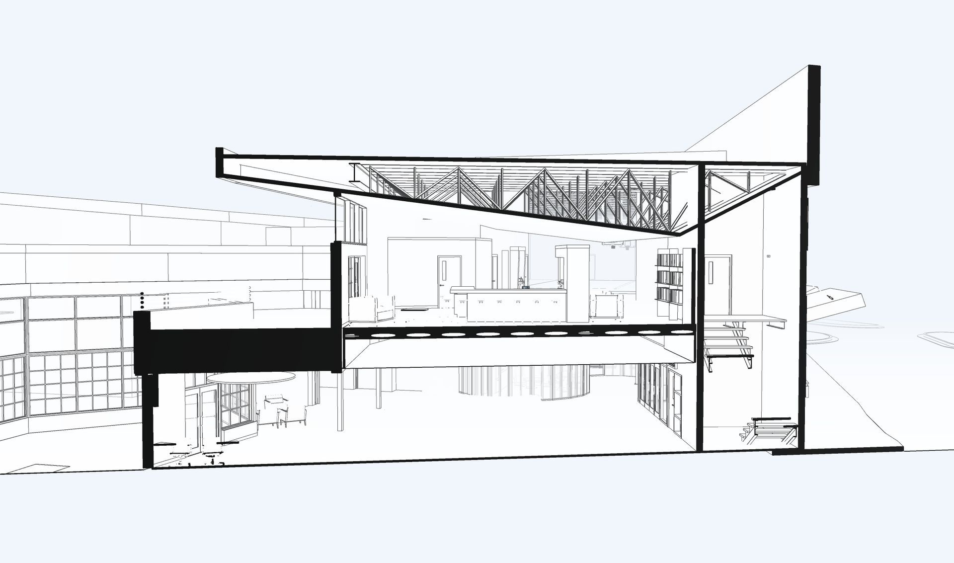 The cantilevered gym mass provides acoustic isolation for the gymnasium yet does not continue to ground level, allowing for a planter layer to create a calm buffer zone between the offices and the public sidewalk.