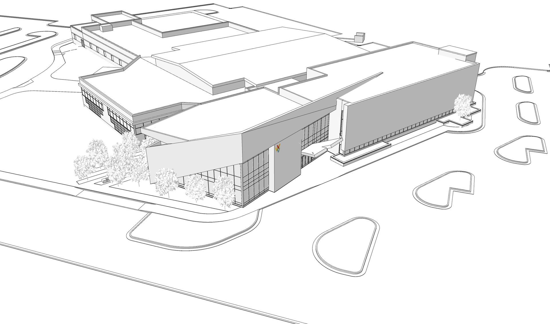 Two landscape areas are incorporated on either side to contrast the large amount of parking needed for the auditorium.